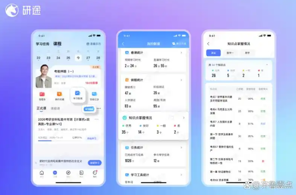 目前,研途已构建起以“研途考研” APP为核心的一站式智能学习平台,突破性实现高等教育多学科高质量知识图谱的构建,并提供基于目标院校、目标分数导向的过考模型,建立科学、动态的统考与非统考全科备考体系。平台全面覆盖PC网校、IOS、安卓、鸿蒙等全学习场景。